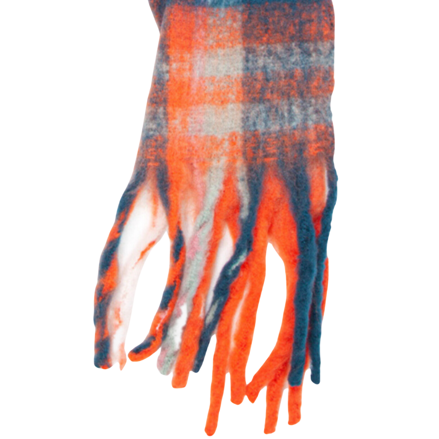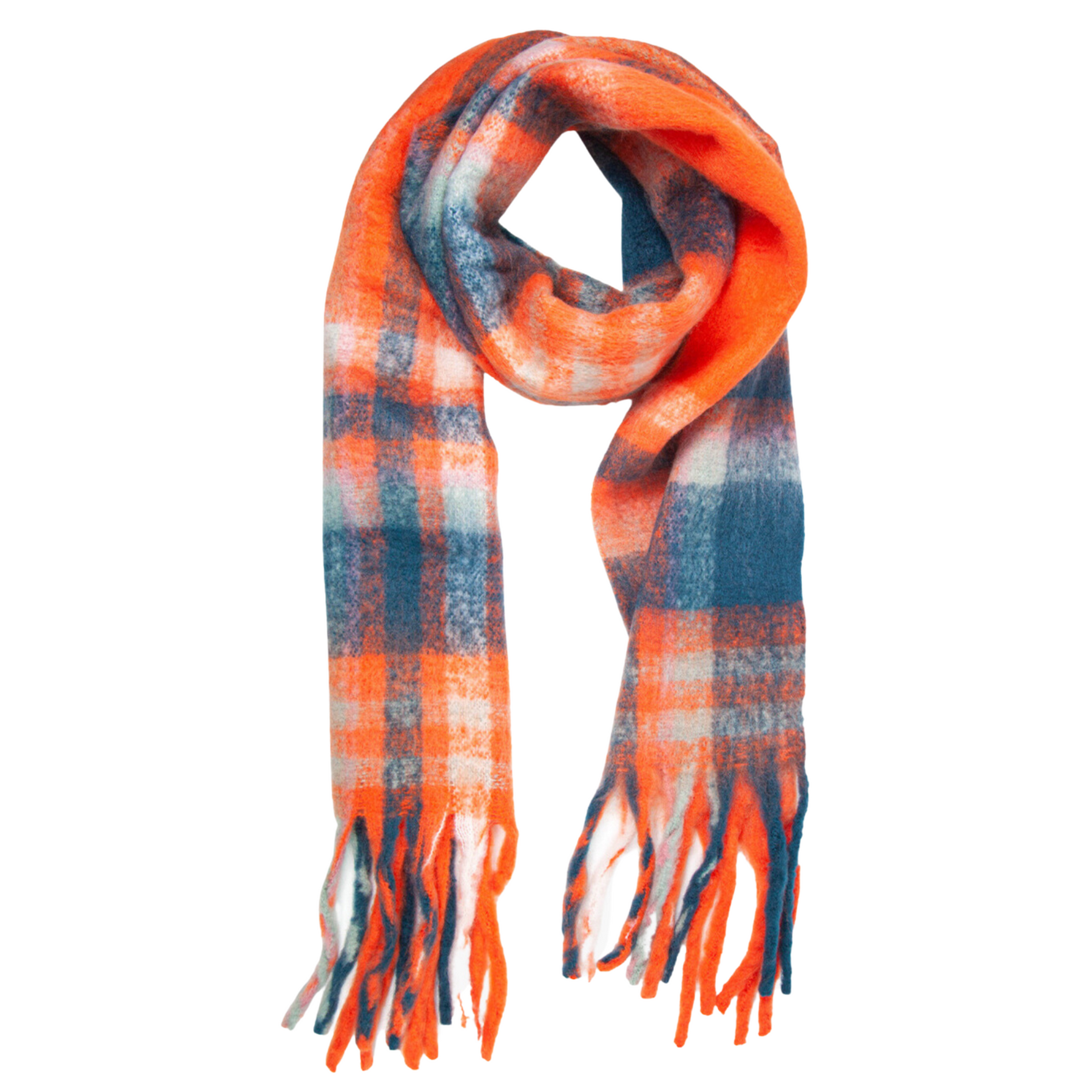 A classic orange and blue check print heavyweight scarf with tasselled edges, perfect for wrapping up this Winter.