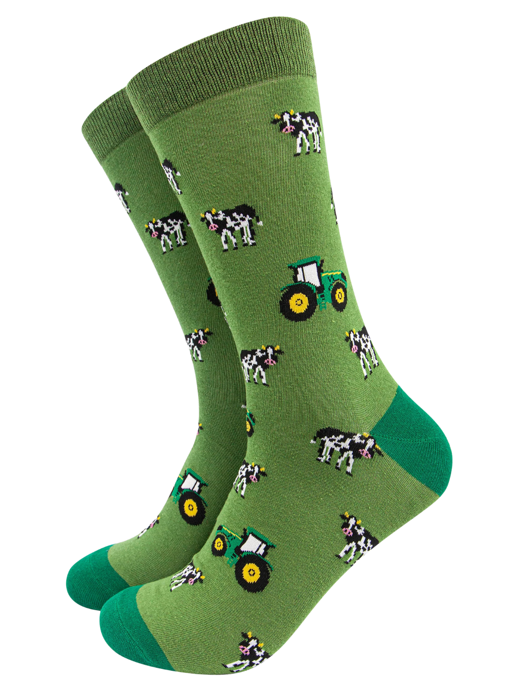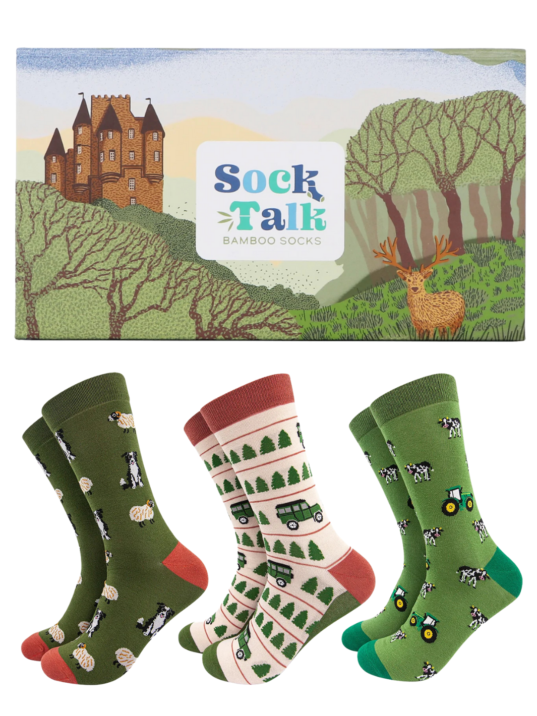 Men's bamboo socks gift set featuring a selection of farm animal and vehicle novelty socks.