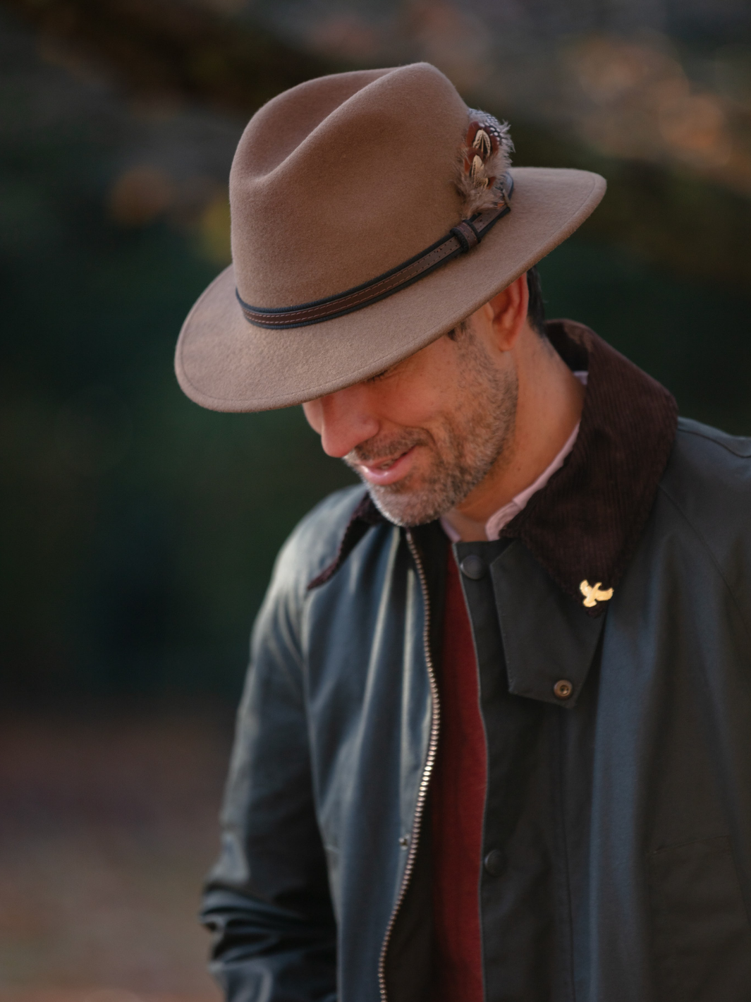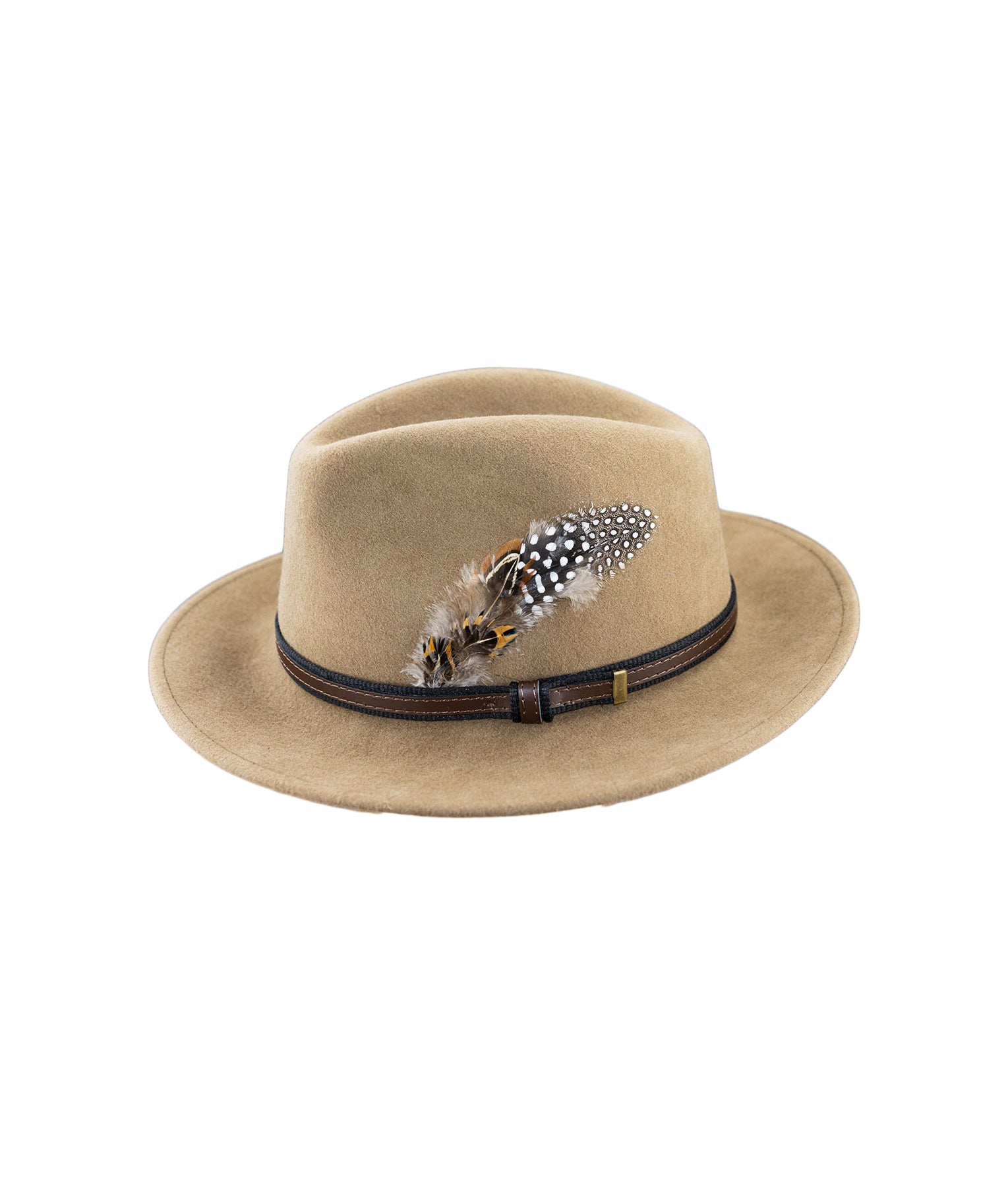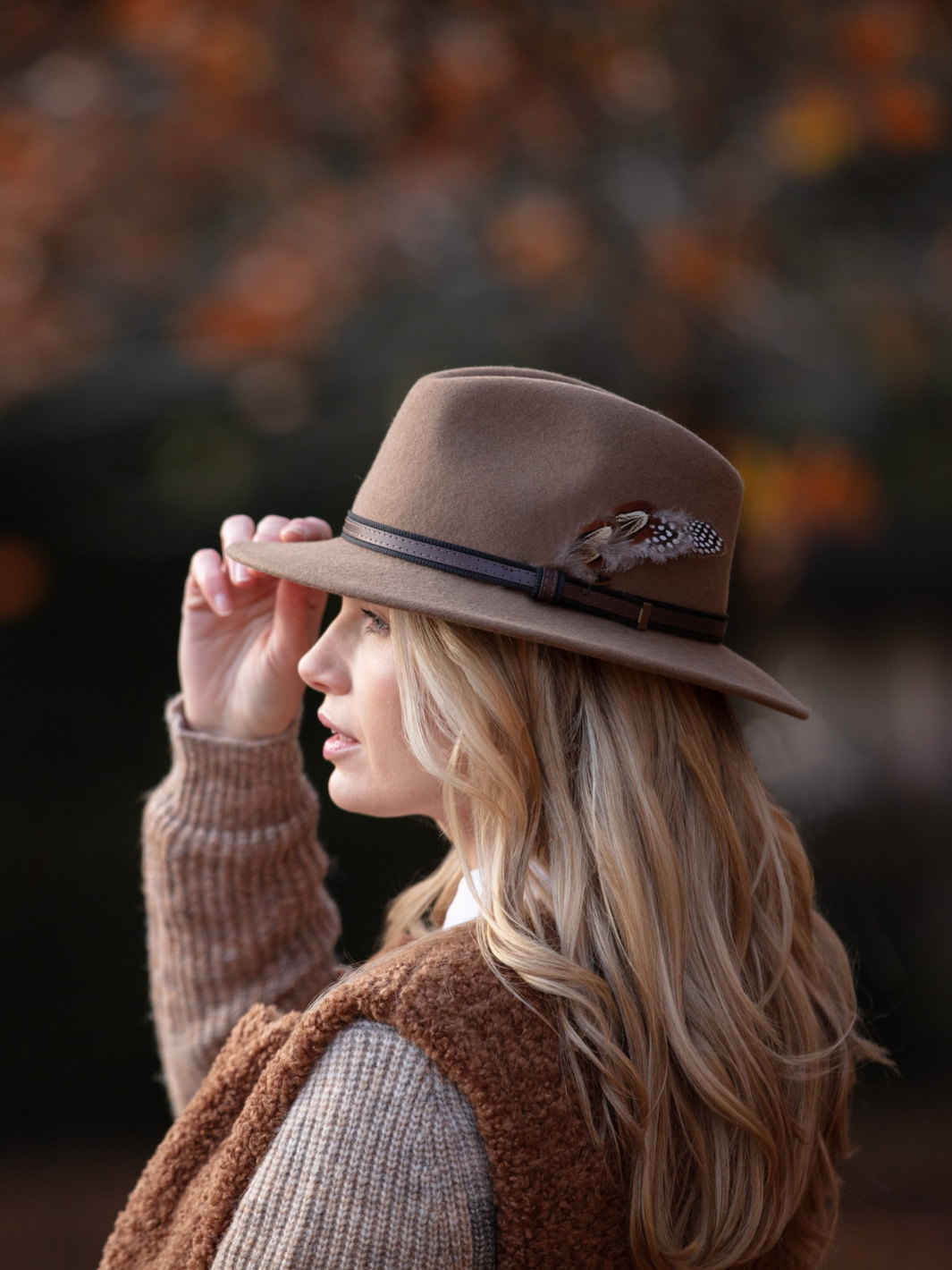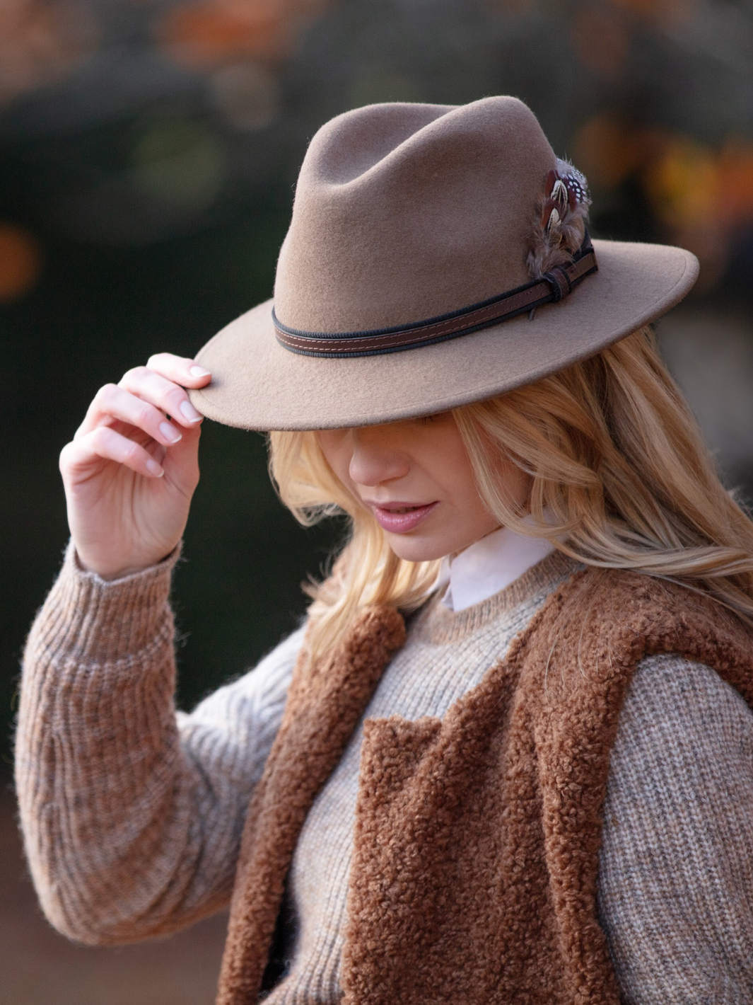 This fedora hat is made from 100% wool and is water resistant, hand finished to an excellent quality. The hat comes with brown feathers that can be removed if you wish, though we think they bring a certain elegance to the look.